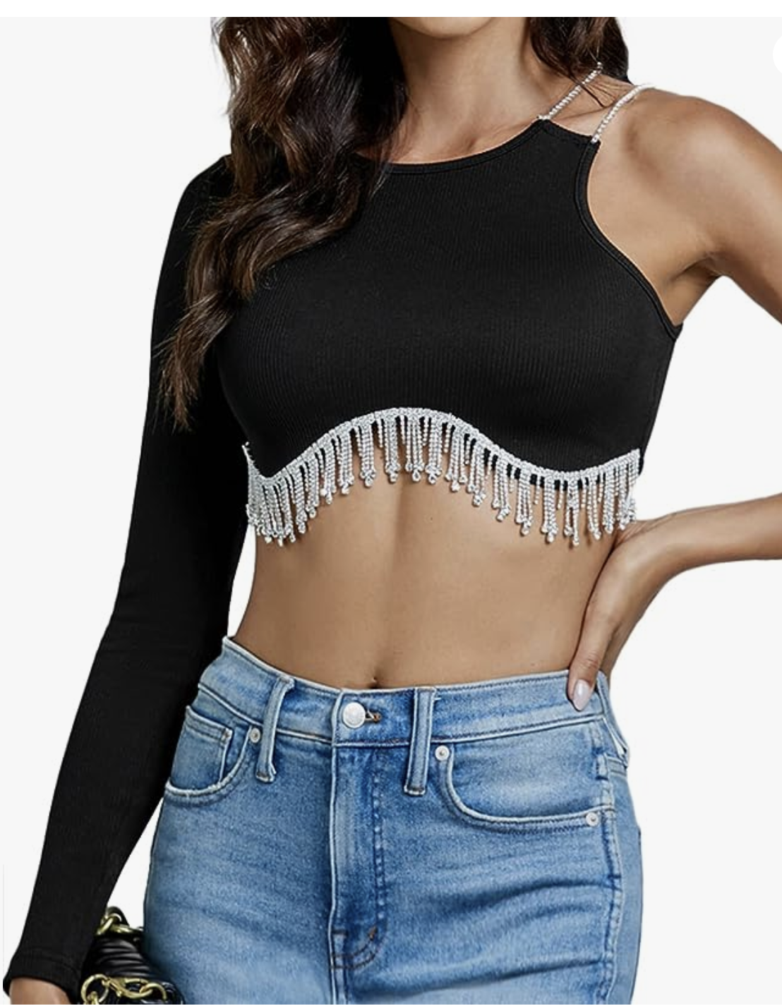 Fringe Asymmetrical Shoulder Crewneck Ribbed Knit Crop Top